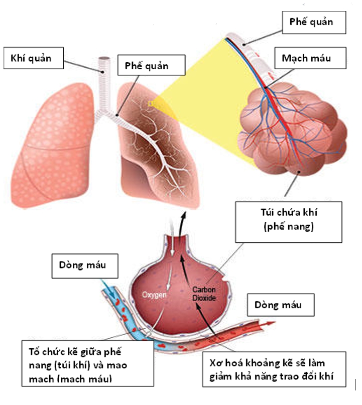 Những tổn thương này theo thời gian có thể dẫn đến xơ hóa, khiến mô phổi trở nên dày và cứng hơn. Hậu quả là phổi mất đi tính đàn hồi, khả năng trao đổi oxy bị suy giảm nghiêm trọng, gây khó thở, ho khan và ảnh hưởng nặng nề đến sức khỏe.